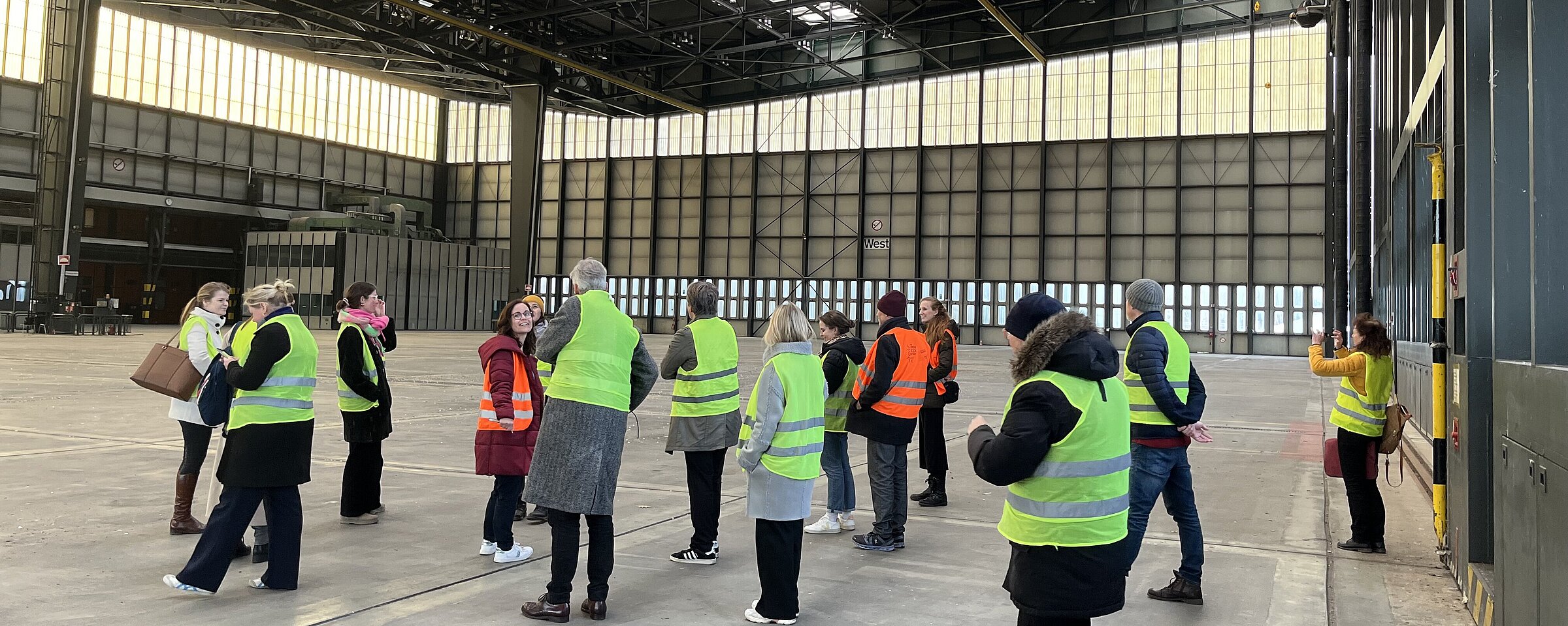 Auch der andere Berliner Ex-Flughafen und ebenfalls Zukunftsort, der Flughafen Tempelhof, stand im Fokus des Austauschs. Immerhin befinden sich beide Flughäfen, Tempelhof und Tegel, im Prozess einer nachhaltigen Konversion. Daher ist die Zusammenarbeit innerhalb der Zukunftsorte von besonderer Bedeutung. Gemeinsame Herausforderungen und Erfahrungen werden geteilt, während beide Flughäfen den Weg der Konversion beschreiten. Unter Denkmalschutz stehend, öffnen sie bereits vor der Sanierung ihre Türen für Kreative und alle, die sich für ihre Entwicklung interessieren.