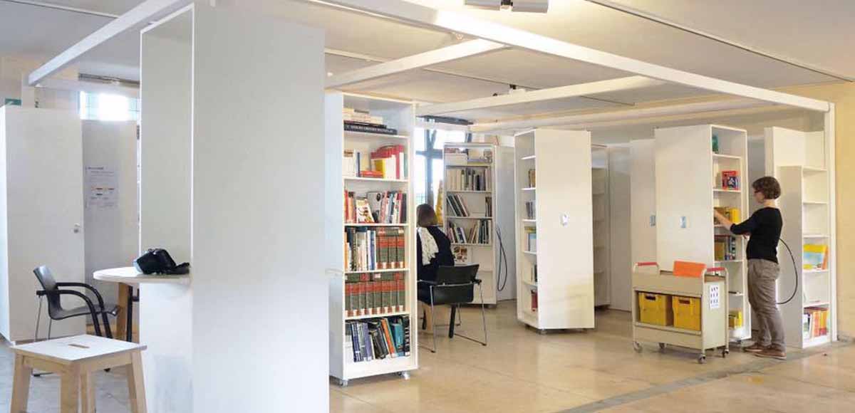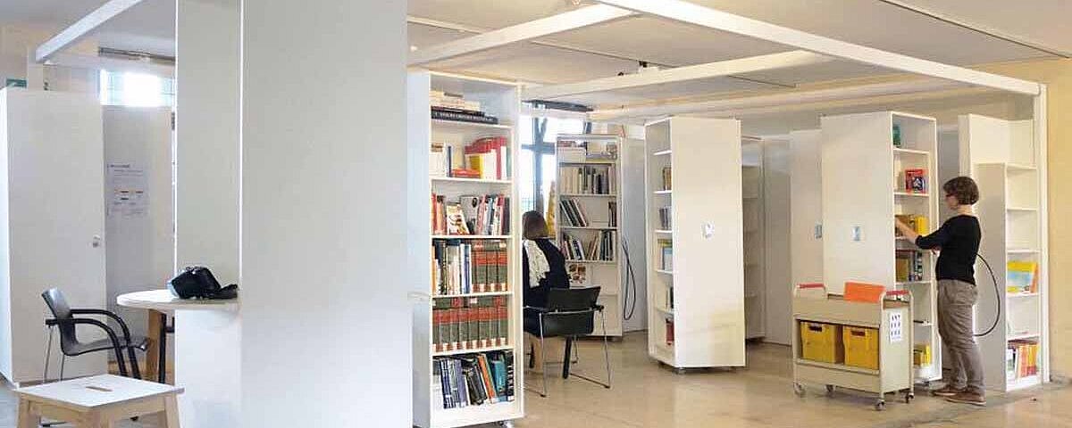 Das Flughafengebäude steht unter Denkmalschutz. Um bauliche Veränderungen in den Flächen zu vermeiden, wurde vom Berliner Atelier 36 ein variables Regalsystem entwickelt. Es besteht aus sechs Bücherkuben auf Rädern, die sich zusammenschieben lassen. Die Rückseiten können als Ausstellungsfläche genutzt werden kann.