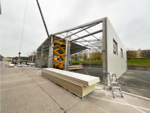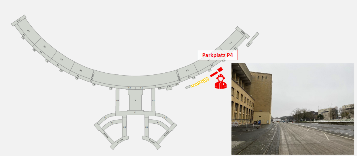 Die Einsatzkräfte waren in der Rollfeldebene A1 untergebracht, doch aufgrund einer Sanierung der Dach- und Betondeckenstruktur wurde ein Umzug erforderlich. Bereits im Dezember 2023 bezog die Feuerwehr daher eine Interimslösung am Parkplatz P4 – bestehend aus einer beheizbaren Fahrzeughalle und einem zweigeschossigen Containeranbau mit Arbeits- und Aufenthaltsräumen.