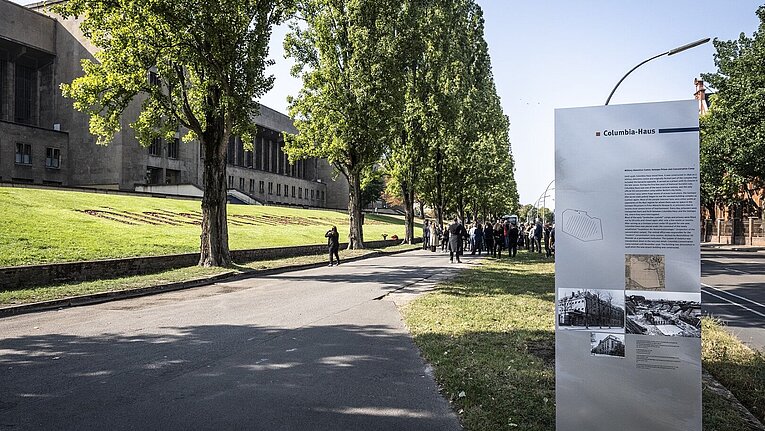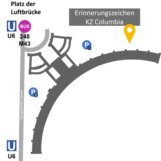 In der Böschung vor dem Flughafengebäude Tempelhof markiert seit September 2024 der langgezogene Schriftzug „nicht mehr zu sehen“ den Ort, an dem keinerlei materielle Spuren mehr von der Geschichte des Konzentrationslagers Columbia (1933-1936) zeugen. Bei dieser Schriftinstallation geht es um die stadträumliche Markierung eines historischen Ortes, der aus dem öffentlichen Bewusstsein fast verschwunden ist. Die Freianlage ist als Drive-By-Situation gestaltet: Möglichst viele Passantinnen und Passanten sollen eine minimale Botschaft im kurzen Zeitintervall des Vorbeifahrens erhalten. Als lapidares und lakonisches Satzfragment soll der Schriftzug Fragen nach dem „Was?“ und dem „Warum?“ nahelegen.