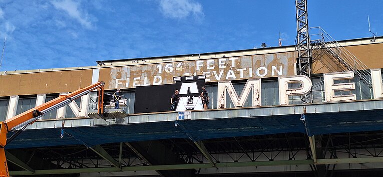 Doch auch Ikonen brauchen Pflege: Im Herbst 2024 wird der 42 Meter lange Schriftzug „Berlin-Tempelhof“ mitsamt seiner Stahlunterkonstruktion wegen der ohnehin stattfindenden Sanierungsarbeiten am Dach demontiert und umfassend restauriert. Nach der Sanierung soll er im nächsten Sommer wieder in neuem Glanz über dem Tempelhofer Feld erstrahlen!